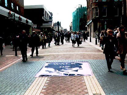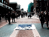 The piece was taped to the pavement in a busy pedestrian area of Derby City Centre for the length of one shopping day. Locating the work here ensured DIRECT ACCESS to a consumer audience and positioned the work in a RELEVENT CONTEXT for its completion.