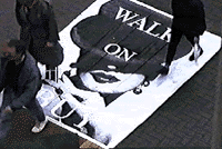 I consider Direct Access and Relevent Context as integral to this piece of work; the fundamental aim being to encourage questioning of advertising and consumerism as directly as possible. In this case by providing a rare and unexpected opportunity to physically interact with an advertisement while in the mental state of consuming. The effect of the consumers interaction is not only a prompting of thoughts but is coupled with their own destruction of the advertisement.