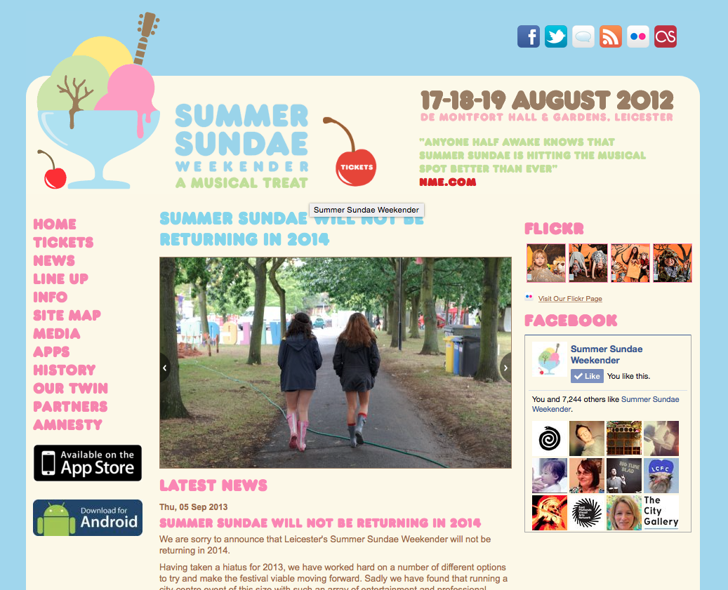Summer Sundae was a great music festival that ran in Leicester between 2001 and 2012. I was involved in various activities at the festival over the years - including the Bathysphere, the Summer Sundae Fringe and Interact Exhibitions - and Cuttlefish created the festival app (one of the first) and website for the final few festivals. Rather than let the website disappear we have archived it. Link below.