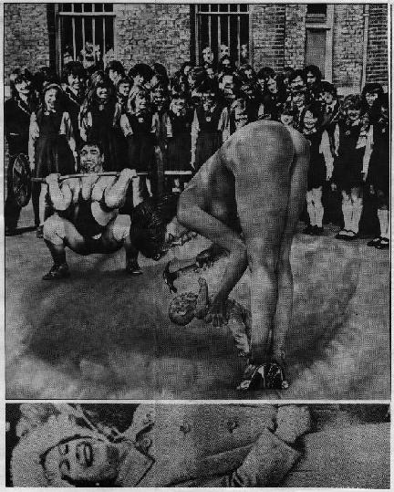 He stands there clasping the torn body of a mutilated woman.
